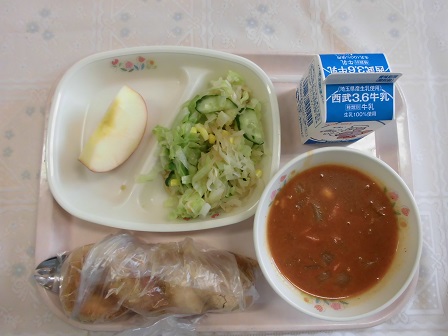 今日のきなこあげパンは米粉ツイストパンでした。おいしかったです。メキシカンシチューはカレー粉も入っているということで、ちょっぴり辛さもありおいしくいただきました。たくあんサラダにはキャベツやきゅうりが入っていて野菜もたっぷりとれました。