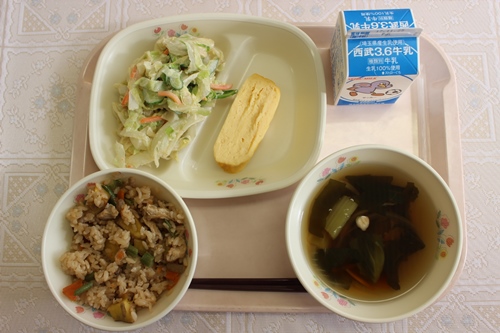 今の秋の香りごはんは、季節の献立でした。茶飯にさつまいもやいんげん、にんじんなどが入っていて彩りがきれいでおいしかったです。みんな、もりもり食べていました。野菜のごまマヨネーズ和えは、キャベツやきゅうりが入っていてシャキシャキでおいしかったです。すまし汁は、やさしい味でおいしかったです。