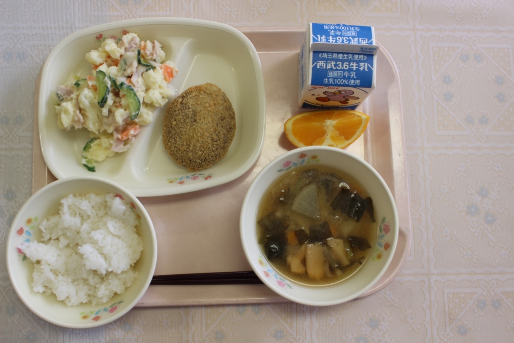 1年生の給食が始まってから1週間がたちました。少しずつ慣れてきた様子で、給食の準備をがんばっています。給食が楽しみな子どももたくさんいます。今日は、メンチカツでした。サクサクでおいしかったです。ポテトサラダは、丁度いい味付けでおいしかったです。オレンジは、甘くておいしかったです。