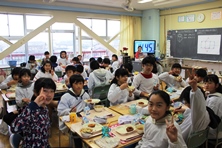 卒業を祝う週間のひとつで6年生は在校生のクラスに散らばって給食を一緒に食べています。