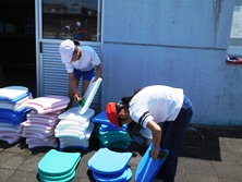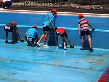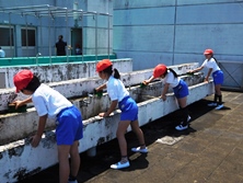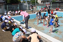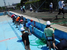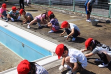 わりばしでタイルの間の草やコケをむしったり、風で運ばれたまった土を集めたりしました。土日晴れたおかげでプール内の土はカラカラに乾き、それほど重くなく運ぶことができました。みんなプールが楽しみなのか一生懸命に掃除をがんばりました。