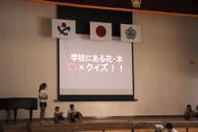 集会の後半では、校庭にある花や木の〇×クイズもやりました。