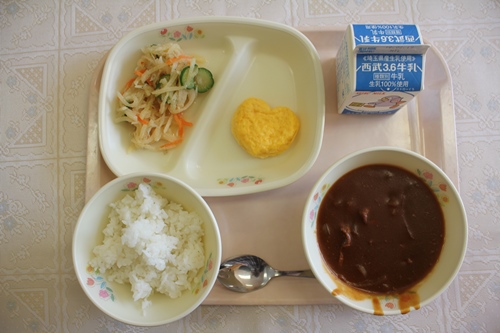 今日は、ハヤシライスでした。こくがあり具だくさんのハヤシライスで子どもたちにも大人気でした。ごはんも、もりもり食べている子が多かったです。オムレツは、バレンタインの日が近いためハート型でした。ほんのり甘いオムレツでかわいくておいしかったです。大根とじゃこのサラダは、大根がシャキシャキしていて、ちりめんじゃこがいいアクセントなっていておいしかったです。