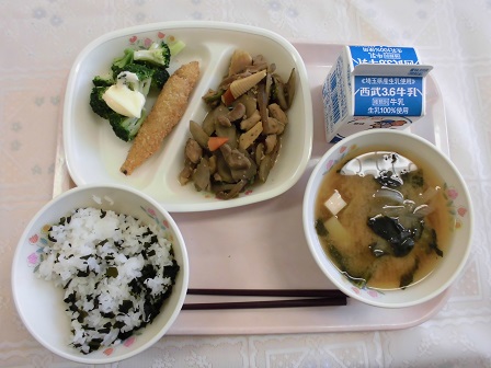 「今日はわかめご飯だ!」「フリッター好き!」子どもたちの声が聞こえてきました。炒り煮でごぼうたっぷり、根野菜もしっかりととれました。みそ汁や、ゆでブロッコリーもおいしくいただきました。