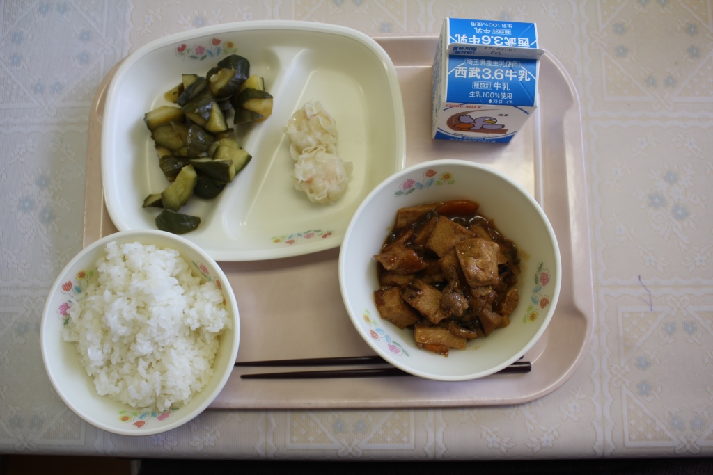 今日は、家常豆腐でした。読み方は、ジャージャン豆腐です。ジャージャン豆腐は、中国四川省の家庭料理の一つです。ジャージャンとは、家庭風とか家にありふれたという意味があり、家で常に食べる豆腐料理ということから、この名前がついたと言われています。麻婆豆腐に少し似ていますが、豆腐ではなく、豆腐を揚げた厚揚げを使うのが特徴です。ごはんに合う味付けでみんなもりもり食べていました。