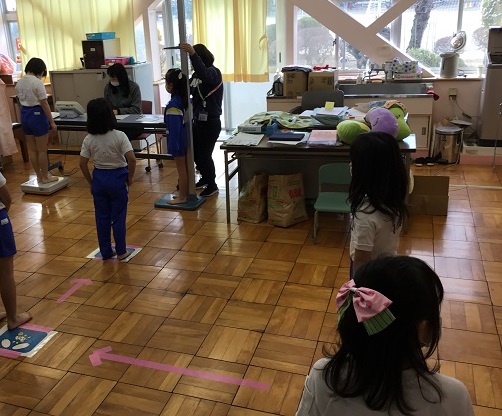 今日は、低学年の身体測定がありました。密にならないように、間隔をあけて並び測定しました。みんな、すくすく成長しています。