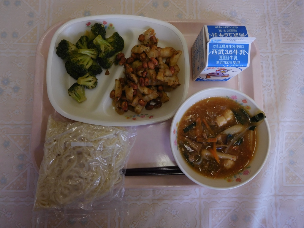 今日は、麻婆ラーメンでした。丁度いい味でとろみがついていて食べやすくておいしかったです。大豆とポテトの揚げ煮は、大豆のカリカリとポテトのほくほくが相性がよくておいしかったです。ブロッコリーのピリッとづけは、少しピリッとしていたけど辛すぎずおいしかったです。