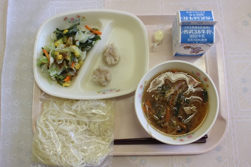 今日は、ごまみそラーメンでした。具だくさんで、まろやかな味わいでこくがあっておいしかったです。子どもたちにも好評で、おいしかったと口々にいっていました。海草サラダは、海のミネラルたっぷりでさっぱりしていて食べやすかったです。
