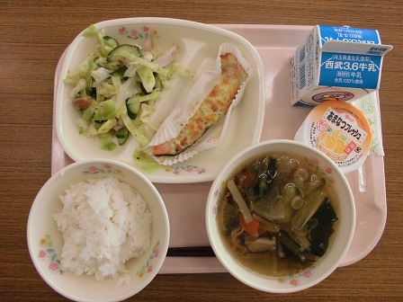 サケはマヨネーズをつけて焼いたもので、味がはっきりとしているので、子どもたちもおいしくいただきました。サラダもしゃきしゃきとしていて、さっぱりといただきました。ゼリーは、甘夏ですっきりとした味でおいしかったです。