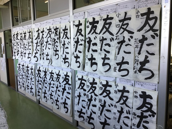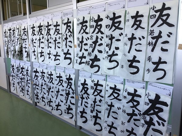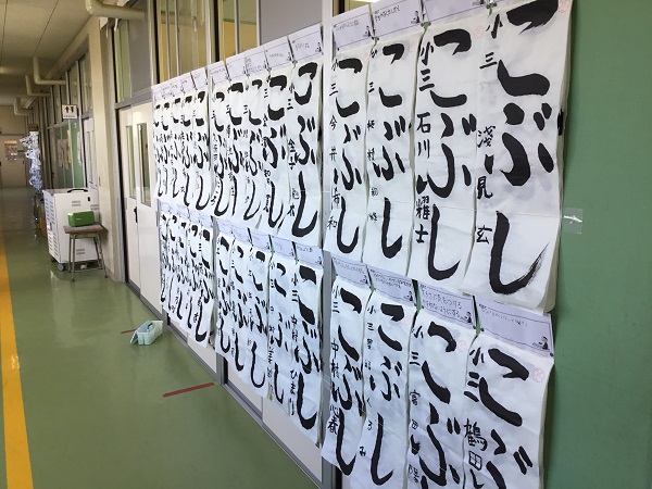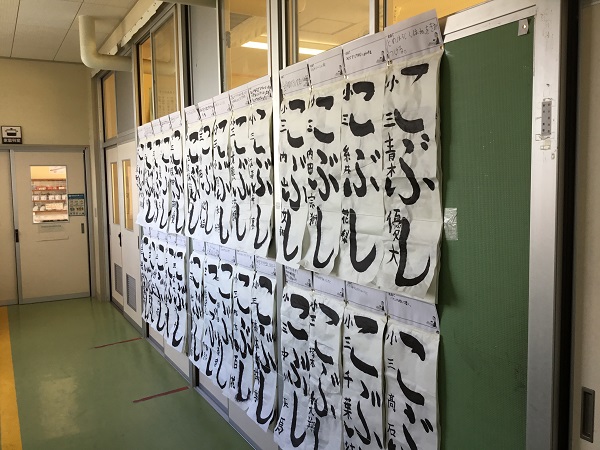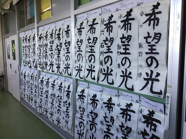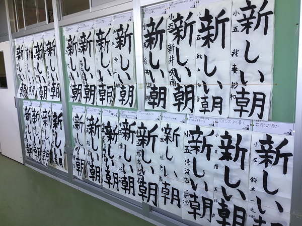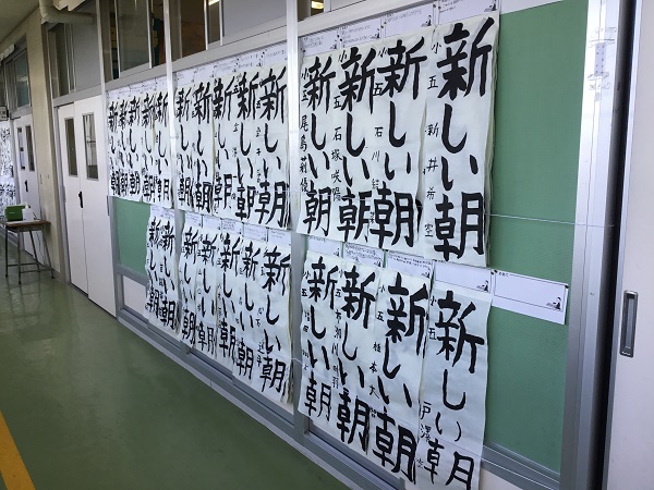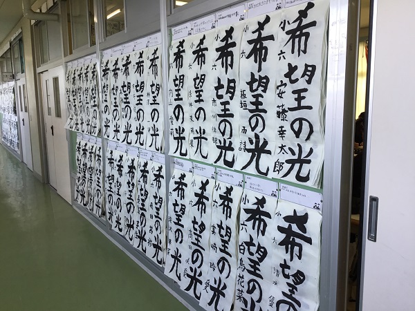 各学年の廊下を見ると、書きぞめ制作会で書かれた作品が掲示してあります。11月に書き始めたころに比べると、みんな成長がみられます。