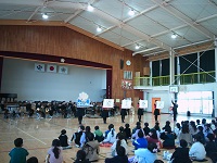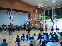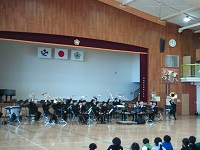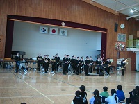 みんなが知っている曲や聞いたことのある曲があり子どもたちは心から音楽を楽しんでいました。いろいろな楽器の説明やそれぞれの楽器の音の違いなども教えていただきました。みんなが知っている「さんぽ」の曲では、体を揺らして演奏を楽しんでいました。岡部小学校の校歌では、全校で歌って音楽を響かせていました。最に交通安全についてのお話もありました。旗の演技と楽器の演奏で子どもたちは見入っていました。アンコールにも応えていただき素敵な時間になりました。