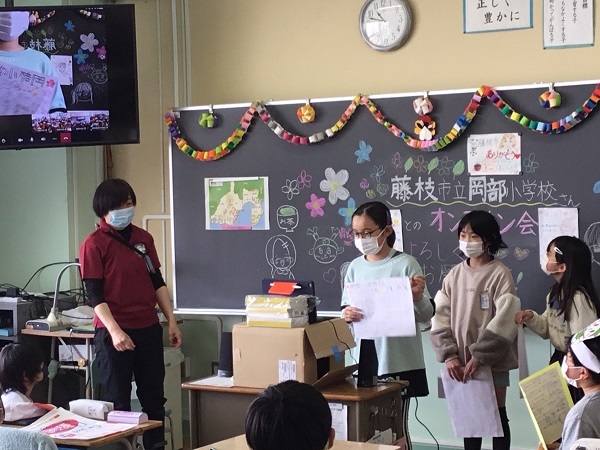 今日は4年生が同じ名前の静岡県藤枝市にある岡部小学校とオンラインで交流会を開きました。4年2組の子どもたちが、岡部小学校の紹介をしたり、深谷市や渋沢栄一翁について紹介しました。また、4年1組の子どもたちが、深谷市、岡部の特産品である、ブロッコリーやとうもろこし(味来)、ねぎについて説明しました。同じ岡部小学校の児童同士ですので、これからも交流が続くといいですね。