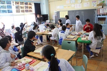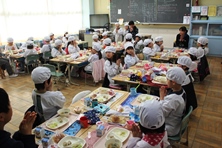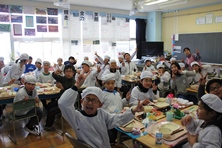 6年生が各クラスに散らばって給食を食べています。