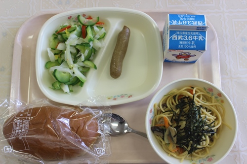今日は、和風スパゲッティーでした。いか、あさり、しめじなどの具材がたくさん入っていて食感もよくて、あまりしょっぱすぎずみんなパクパク食べていました。夏色サラダは、季節の献立でした。赤ピーマン、黄ピーマン、きゅうりなどの季節の野菜をたくさん使っていておいしかったです。彩りもきれいで、夏らしさが感じられました。暑い日が続いていますが、たくさん食べて元気に過ごしましょう。