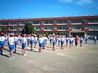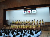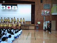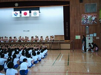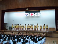 全校朝会で来週、親善運動会に参加する6年生のために壮行会を行いました。種目別で出場する選手の紹介がありました。堂々とした姿で返事をして立っていました。在校生は、「がんばってください」の気持ちを伝えることができました。