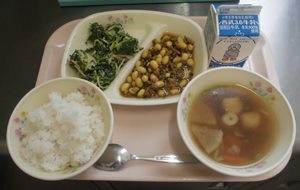 今日の給食では、ソイ丼が出ました。ひき肉、大豆、ベーコン、春菊が入っておりカレー味なので食べやすく子どもたちにも人気なメニューです。
