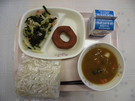 カレーうどんは、子どもたちも大好きで、食が進みました。おひたしは、野菜たっぷりで、さっぱりとしていておいしかったです。玉子ドーナツは、ちょっと堅めのドーナツで、甘くておいしかったです。