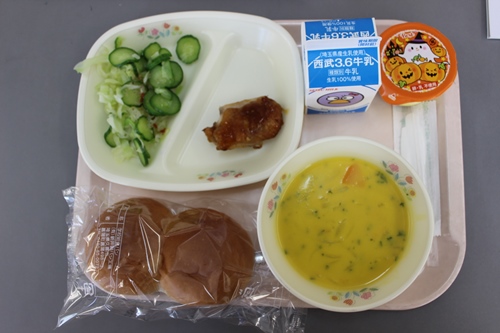 今日は、ハロウィンでしたのでかぼちゃを使った献立でした。パンプキンスープは、かぼちゃの甘みがあってまろやかな味わいでおいしかったです。子どもたちも喜んで食べていました。ハロウィンデザートは、かぼちゃのプリンでした。優しい甘さでおいしかったです。今月の給食目標は好き嫌いなく何でも食べようでしたが、好き嫌いなくいろいろな食べ物を食べることができましたか。これからも、好き嫌いなく何でも食べましょう。