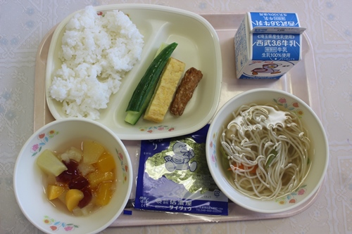 今日は、七夕の日です。給食も七夕仕様の献立になっていました。七夕スープは、にんじん、大根は短冊に、さやいんげんは、笹の葉、そうめんは天の川に見立ててありました。その中に、星のふ、オクラは、夜空に浮かぶ星になって入っていました。彩りがかわいい七夕らしいスープになっていました。やさしい味付けでおいしかったです。星のフルーツポンチは、星形のパイナップルとナタデココが入った特別なフルーツポンチでした。色とりどりの果物とゼリーもきれいでした。星がたくさん入った献立で子どもたちにも人気があり、かわいい、きれいなどの声がたくさん聞こえてきました。