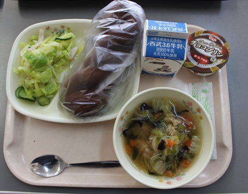 今日は、ココア揚げパンでした。濃厚なココアの揚げパンで、もちもちでおいしかったです。子どもたちにも人気で喜んで食べていました。おかわりしている子もたくさんいました。白菜と肉団子のスープは、柔らかい肉団子が入っていて、しょうがの効いたスープでおいしかったです。デザートは、チョコプリンでした。やさしい甘さでおいしかったです。