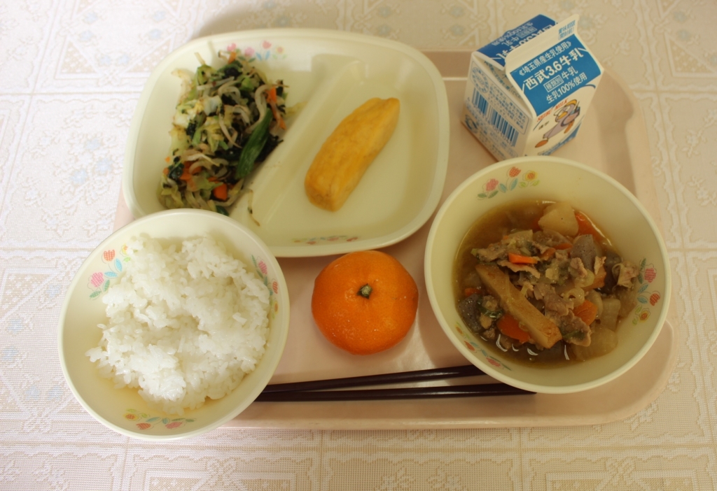 今日は、大根と豚肉の煮込みでした。大根に味がよくしみていてやわらかくておいしかったです。ごはんにも合う味付けでごはんが進みました。子どもたちももりもり食べていました。厚焼きたまごは、甘めでおいしかったです。磯の香あえは、野菜のシャキシャキ感とのりが合っていてあっさりしていておいしかったです。