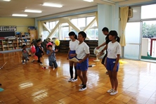 まだ練習を始めたばかりですが、歌詞を見ながら動きの確認をしています。実際にやってみると計画したとおりにいかないところもあるので、担当の先生と児童が話し合いながらよりよい物にしていこうとがんばっています。