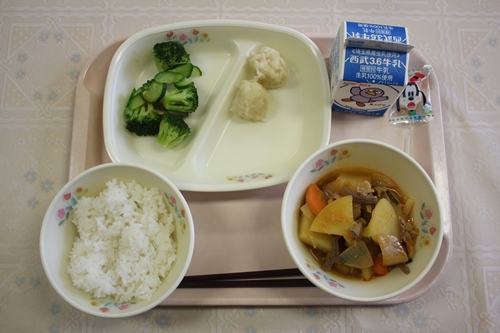 今日は、じゃが豚キムチでした。キムチが入っていましたが、ほどよい辛さでごはんとの相性もよくおいしかったです。子どもたちもたくさん食べていました。今月の給食目標は、身じたくや環境を整えようです。しっかり身じたくや環境を整え、楽しく給食の時間が過ごせるようにしましょう。