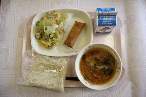 今日は、ごま味噌ラーメンでした。こくがあるスープで具だくさんでおいしかったです。麺ともよく絡んで食べやすかったです。子どもたちも嬉しそうにもりもり食べていました。春巻きは、皮がパリパリで具だくさんでおいしかったです。中華サラダは、マイルドな味付けでキャベツがシャキシャキでおいしかったです。