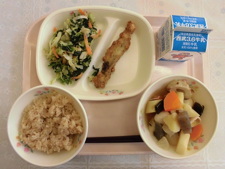 練り製品をはじめとした具がたっぷりと入ったおでんは、温かくて冬の献立にぴったの一品です。茶飯も子どもたちは好きで、おいしくいただきました。ししゃもフリッターは、おいしく栄養たっぷりです。