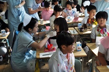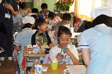 2~3人の児童に1人、衛生士の方についてもらって歯垢の染め出しや、口の中の細菌を調べました。唾液を調べ、細菌のなかでむし歯菌がどのくらいいるかわかるテスト(RDテスト)です。結果ほとんどの児童がむし歯菌が少ないということでした。