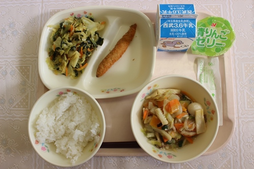 今日は、うまに丼でした。白菜やチンゲンサイ、たけのこ、いか、うずらの卵などが入っていて具だくさんで、とろみがあっておいしかったです。ごはんにのっけて、うまに丼にしてみんなおいしそうに食べていました。小松菜とじゃこの炒り煮は、カレー味で食べやすかったです。今日から、12月になりました。今月の給食目標は、冬の食事について知ろうです。冬の食事について知れるようにしましょう。寒くなってきましたが、たくさん食べて元気に過ごせるようにしましょう。