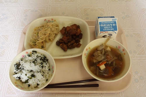 今日は、わかめごはんでした。子どもたちに人気のメニューで喜んで食べていました。もりもり食べておかわりしている子もたくさんいました。豚肉のかりん揚げは、レバーが入っていて鉄分たっぷりでした。ねぎぬたは、ねぎをごまみそで和えてある物で食べやすくなっていておいしかったです。けんちん汁は、具だくさんでやさしい味でおいしかったです。