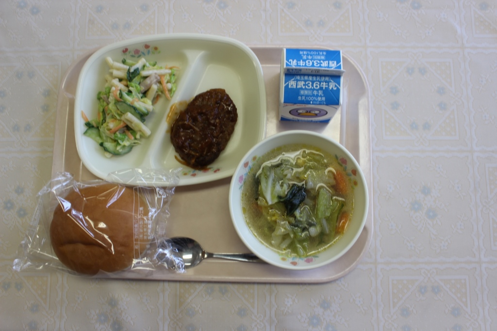 今日は、ハンバーガーでした。パンに、ハンバーグをはさんでハンバーガーにしてみんなおいしそうに食べていました。ソースは、タマネギが入っていて甘めでこくがありおいしかったです。野菜コンソメスープは、野菜がたっぷり入っていて具だくさんでおいしかったです。