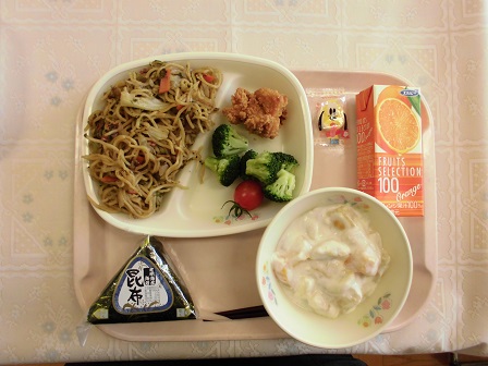 今日のフリー参観ではお世話になりました。授業で頑張った子どもたちは、給食をおいしく食べました。おにぎり、焼きそば、とりの唐揚げ、ヨーグルトなど、子どもの好きなメニューばかりでした。チーズやブロッコリーもあり栄養満点で、おいしかったです。