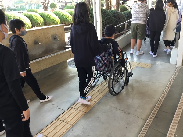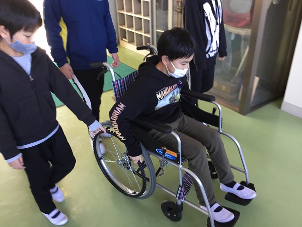 今日の5校時、5年2組では、車いす体験学習をしていました。実際に自分で乗って操作したり、補助をしたりして、自分が車いすを使用している人にどこで、どんなことをすればよいのか考えることができました。また、車いすバスケットをする人はすごいななどとの声も聞こえました。