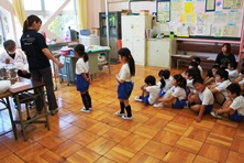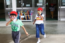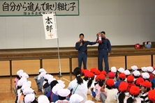 体育館では消防署の職員に来ていただき消火器についてお話していただきました。雨だったため実際に見せていただくことはできませんでしたが