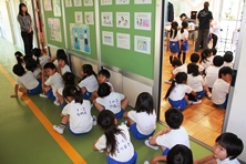 廊下ではしっかりと静かに待てています。中でも並んで待てました。
