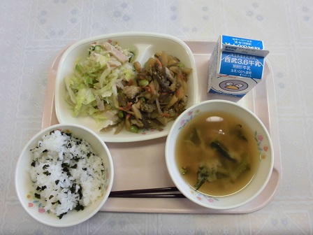 わかめごはんもハムと大根のサラダも、さっぱりといただけておいしかったです。旬の大根は色々な料理に使えて、今が一番おいしいですね。きんぴらは、じゃがいもだけでなく具沢山でグリンピースも入っていました。