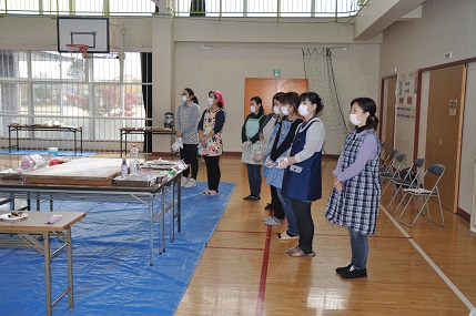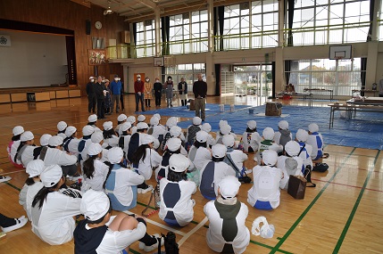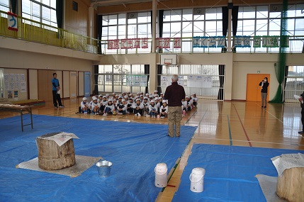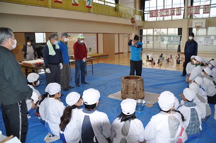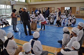 5年生の総合的な学習では、1年間を通して稲作から餅つきまで、体験学習が行われます。本日はそのまとめとして、体育館で餅つきが行われました。一学期には「田植え」、二学期は「稲刈り」「脱穀」そして本日の「餅つき」です。『岡部の自然を愛する会』のボランティアの皆様や岡部ロータリークラブ、保護者、地域の皆様のご協力より、約20年前から体験学習を行っています。