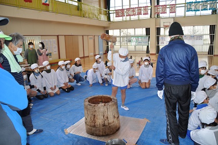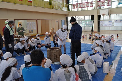 臼と杵で本格的に餅をつくことは、子どもたちなかなか経験がないので、緊張しながらも楽しく体験をしていました。出来上がった餅は、その場でおいしくいただきました。