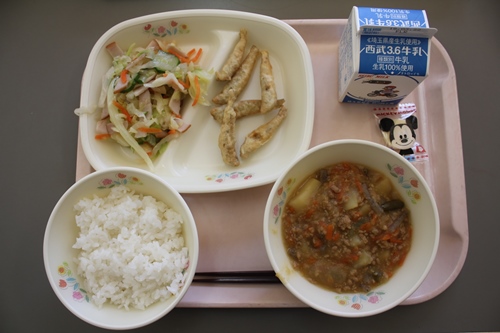 今日は、小いわしんぉ天ぷらでした。天ぷらになっていて全部が食べられてカルシウムたっぷりでおいしかったです。ほどよいしょっぱさで子どもたちも食べやすかったようでした。じゃがいものそぼろ煮は、じゃがいもがやわらかくてとろみがあってごはんとの相性もよくて食べやすかったです。たくあんサラダは、たくあんとキャベツの食感がよくてさっぱりした味付けでおいしかったです。