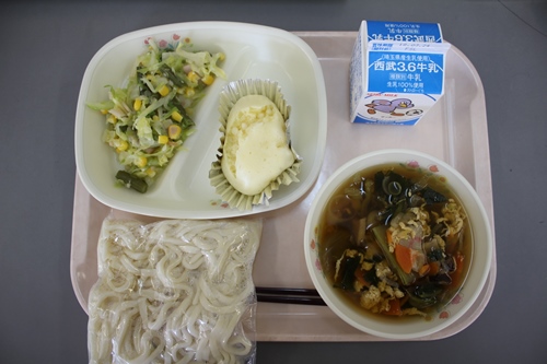 今日は、玉子とじうどんでした。玉子や野菜がたっぷり入っていてやさしい味のスープでうどんとも合っていておいしかったです。スープまできれいに食べているクラスがほとんどでした。ホワイトデーにちなんでホワイト蒸しパンが出ました。ホワイトチョコが入っていて、甘くてふわふわでおいしかったです。春野菜のソテーは、キャベツとさやいんげんが入っていて、緑色が鮮やかで見た目も春らしくておいしかったです。明日は、好きな給食アンケートで第1位になったカツ丼が出ます。みなさん、楽しみにしていてください。