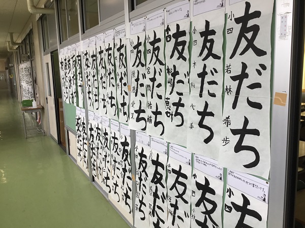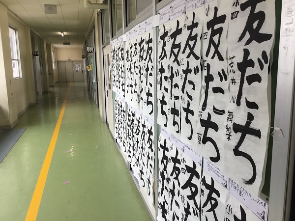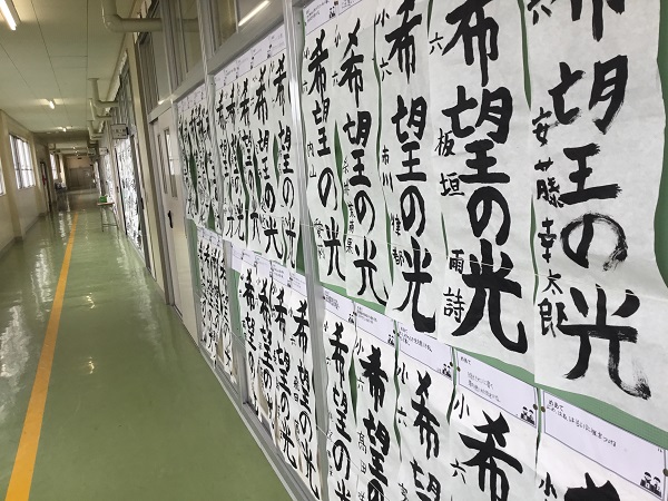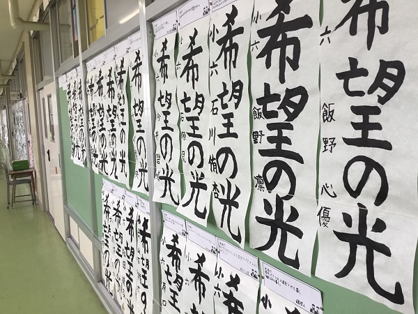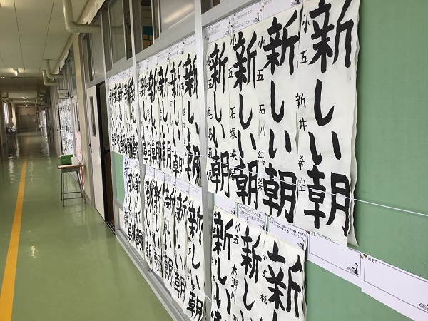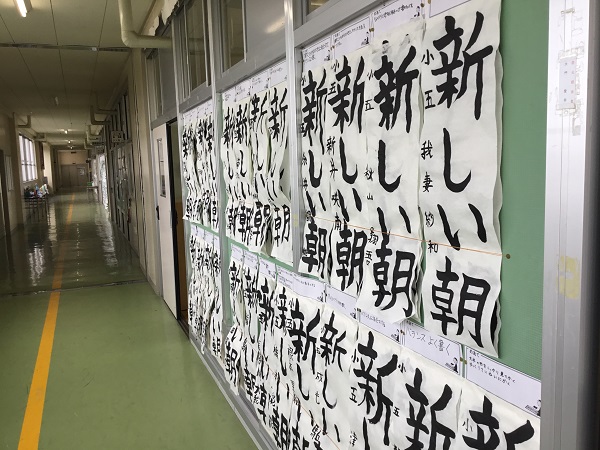 3階には、4年、5年、6年生がいます。廊下には、3学年とも書きぞめの練習した作品が掲示してあります。これから、冬休みも自宅でも練習をし、1月19日の競書会(書きぞめ制作会)に臨みます。書けば書くほど書きぞめは上手くなります。