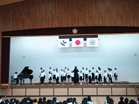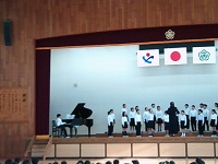 本日の音楽朝会で4年2組の児童が市内音楽会に向けて合唱練習の成果を全校に披露しました。