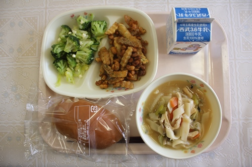 今日は、煮ぼうとうでした。煮ぼうとうは、具がたくさん入っていて、やわらかくやさしい味付けでおいしかったです。大豆とポテトの揚げ煮は、大豆がカリカリでポテトがやわらかくて、たれに絡んでいておいしかったです。みんなしっかり食べていて、ほとんどのクラスが完食をしていました。