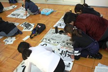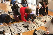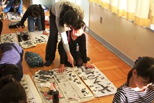 児童の後ろから筆運びなどを教えるなど、職員の指導にも熱が入っています。15,16日と学校行事の都合で練習ができないため、この3連休で練習をがんばれたでしょうか。17日が最後の制作日になります。練習の成果をがんばって発揮しましょう。