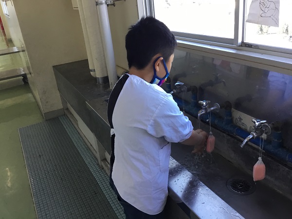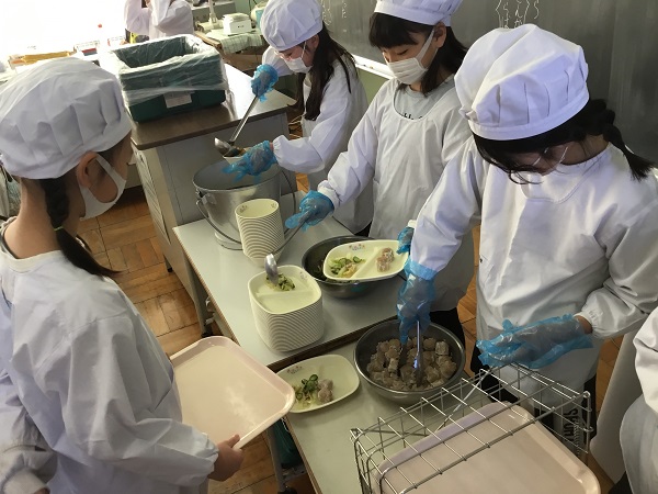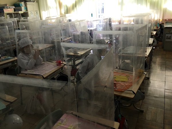第3学期の給食は今日からです。今までのように、シールドを設置し、当番は手袋を着用し、全員前向きで食べます。