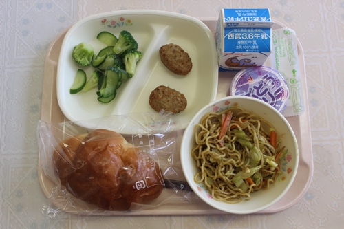 今日は、インディアン焼きそばでした。カレー風味の焼きそばで子どもたちにも人気でした。バターロールにはさんで焼きそばパンにしたり、そのまま食べたりいろいろな食べ方をしておいしそうに食べていました。ぶどうゼリーは、甘くてみんなうれしそうに食べていました。