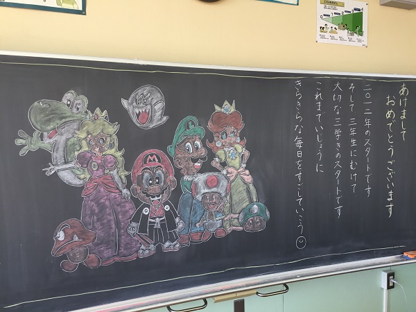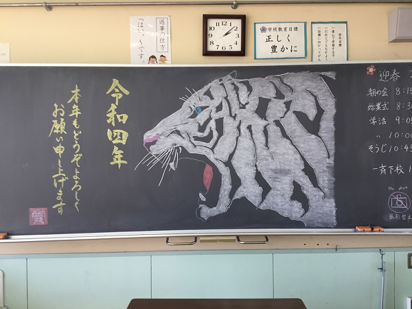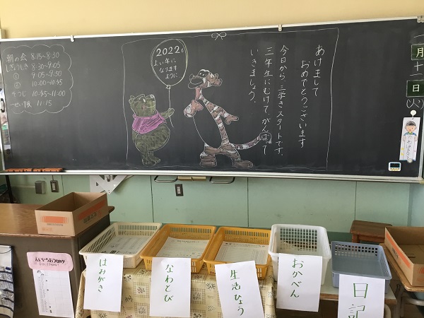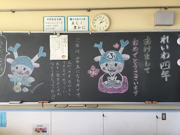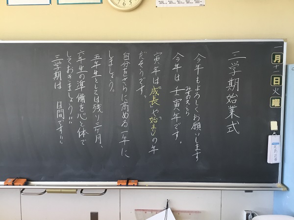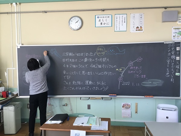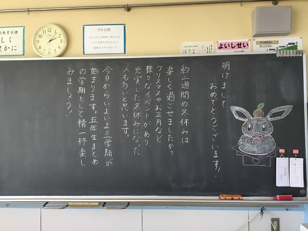 今日は、3学期の準備に来ている先生がたくさんいます。教室を掃除したり、お花を飾ったり、黒板にメッセージを書いたり、来週11日(火)に岡部小学校のみんなが元気に登校してくるのを待っています。明日からの3連休は体を学校の生活に戻す練習をしてみるのもいいですね。