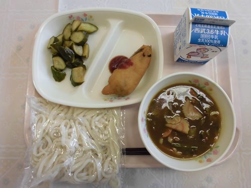 夏休みは、元気に過ごせましたか。今日は、2学期最初の給食でした。カレーうどんは、だしがきいているスープでうどんとよく絡んでおいしかったです。子どもたちももりもり食べていました。アメリカンドックは、ほんのり甘めの衣でおいしかったです。子どもたちもおいしかったと言っていました。2学期もたくさん食べて元気に過ごしましょう。
